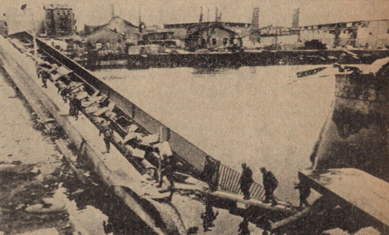 This drive set the first bridgeheads over the Oder last February. Then came the news blackout on Zhukov’s front and the Moscow press gave attention to the battles in Austria and Czechoslovakia. But everyone knew the tremendous supplies being heaped up behind hard-won Oder bridgeheads for the final smash to Berlin. The enemy also knew and attempted many counterattacks on the bridgeheads but without success.